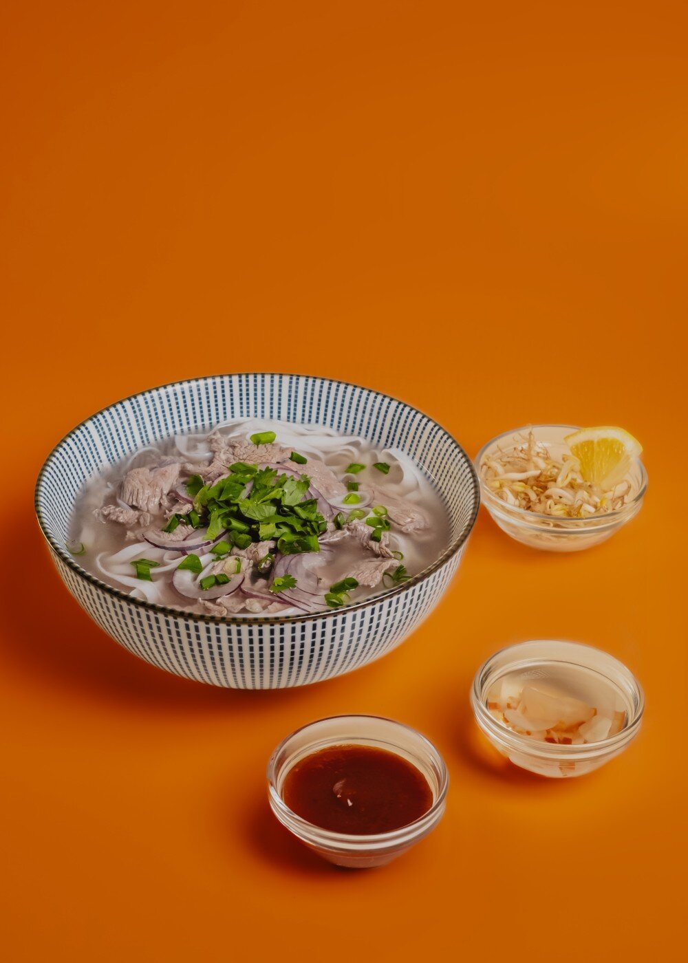 В основу супа входят насыщенный мясной бульон, рисовая лапша, вареная говядина, кинза, зеленый и красный лук. Подается с уксусным соусом и соусом ширача, а также ростками сои и лимона.