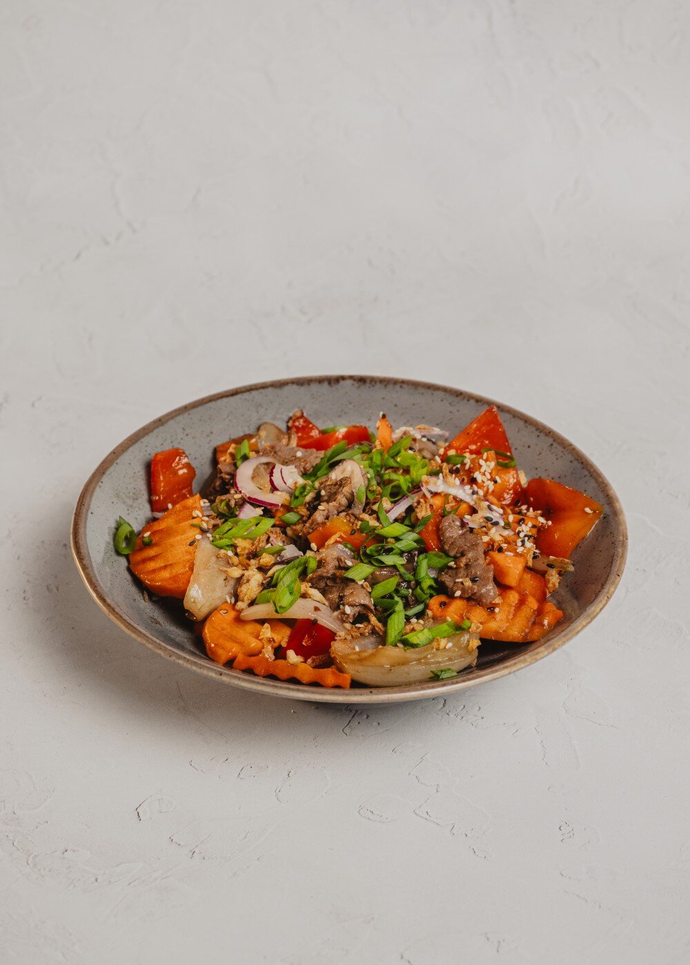 Горячий салат с говядиной, шампиньонами, болгарским перцем и луком, приготовленный на воке в фирменном соусе. Подается с зеленым, красным луком и кунжутом.
