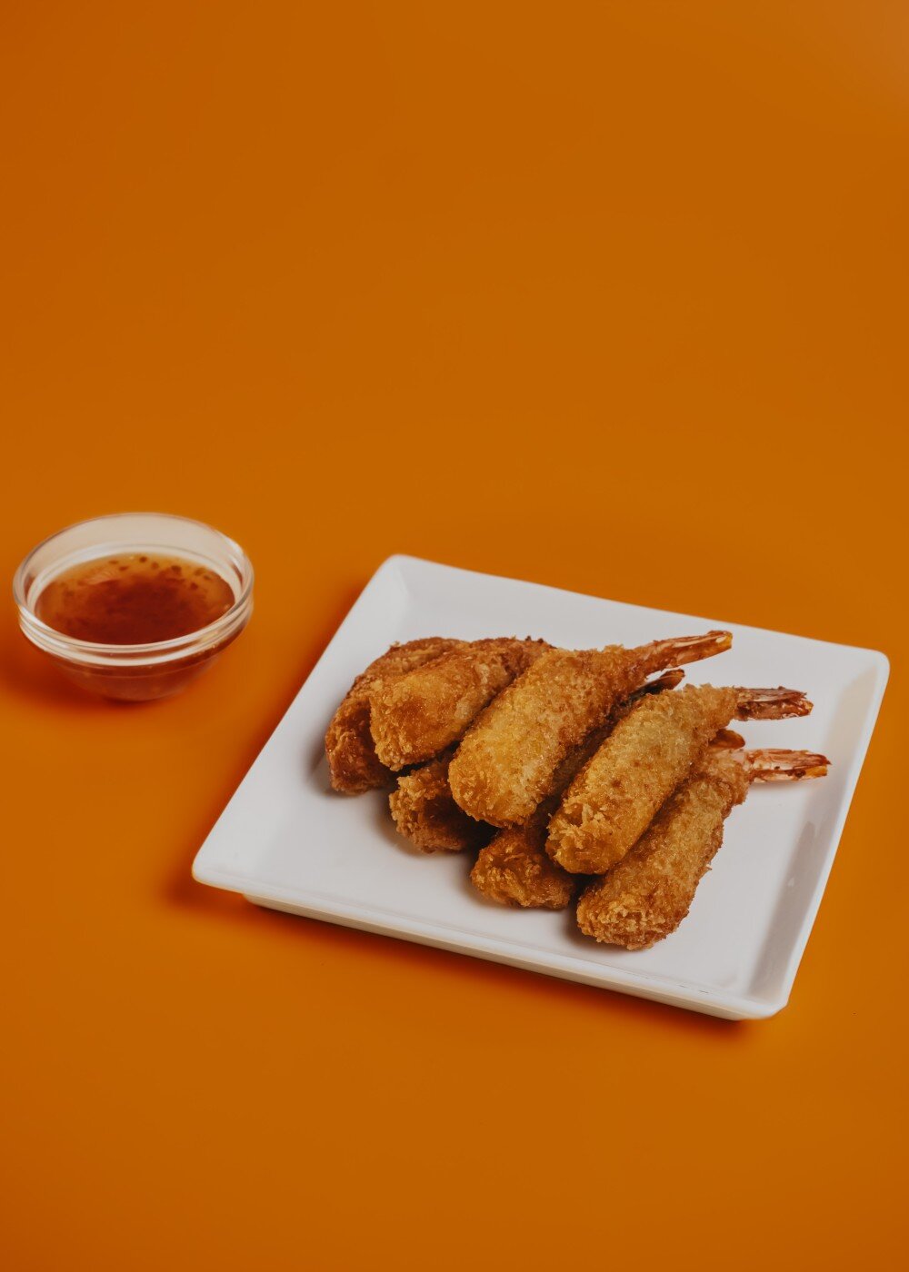 Хрустящие креветки в темпуре (7 шт.), подаются с кисло-сладком соусом.
