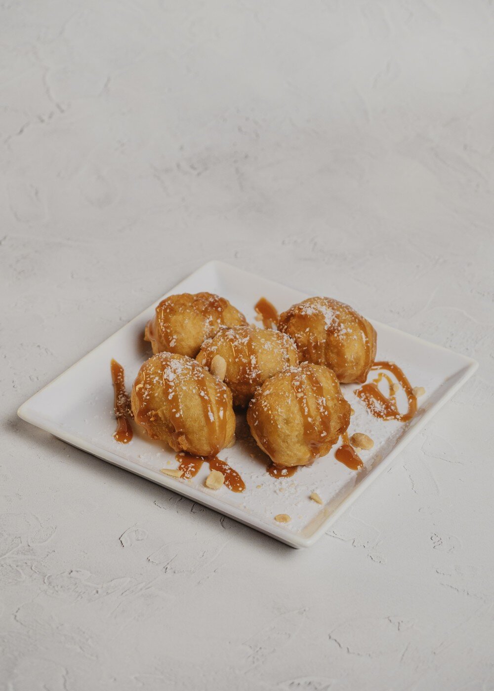 Кусочки банана в темпуре, запеченные во фритюре. Украшенные карамельном сиропом, арахисом и кокосовой стружкой.