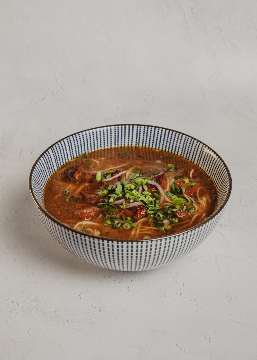 В основу насыщенного супа входят мясной бульон, томатная паста, мягкие кусочки говядины, зеленый и красный лук, рисовая вермишель бун.