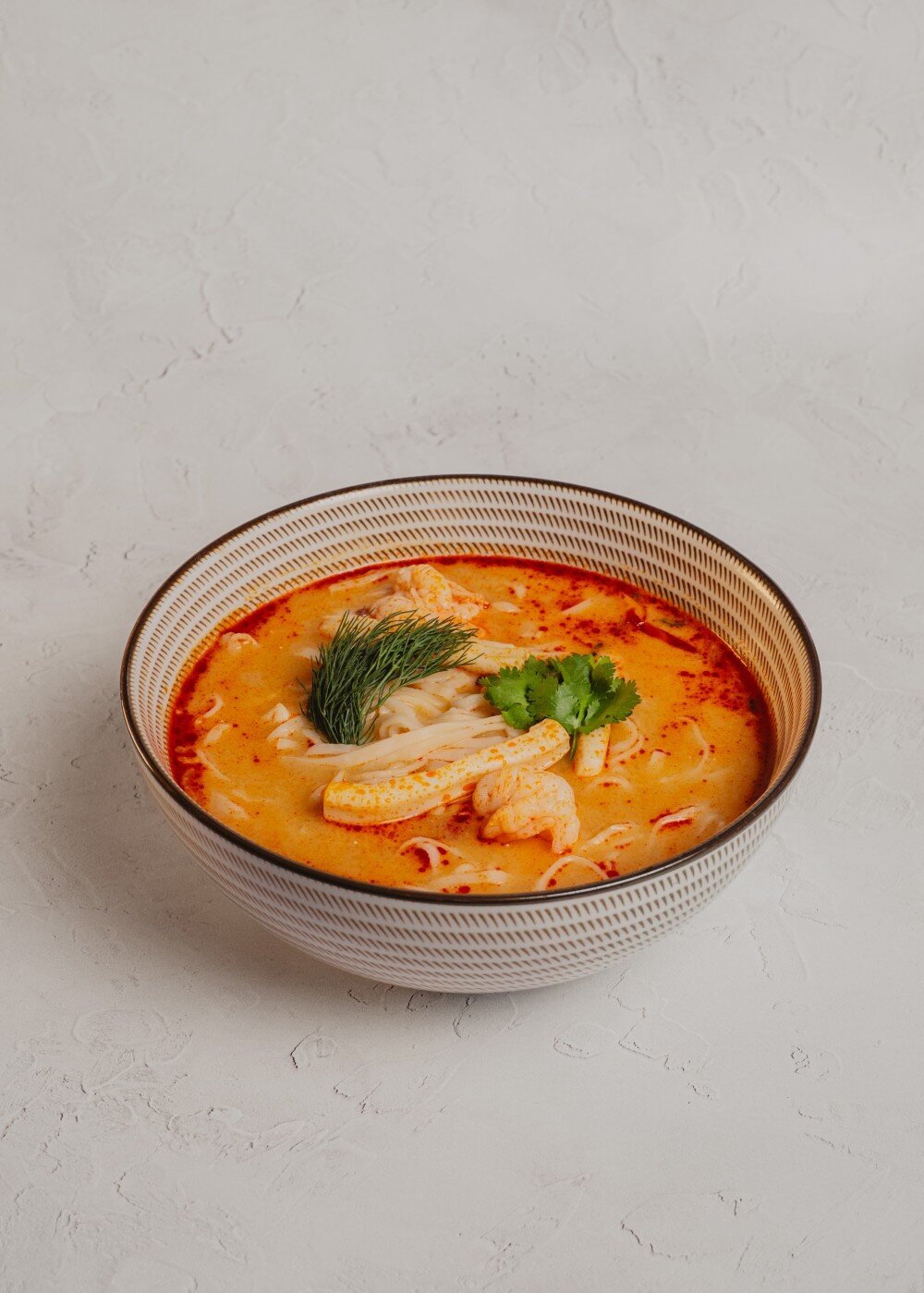 Суп, в основу которого входит лапша удон, тигровые креветки и кальмары, а также насыщенный бульон, приготовленный на кокосовом молоке и панцирей креветок. Посыпается укропом и кинзой.