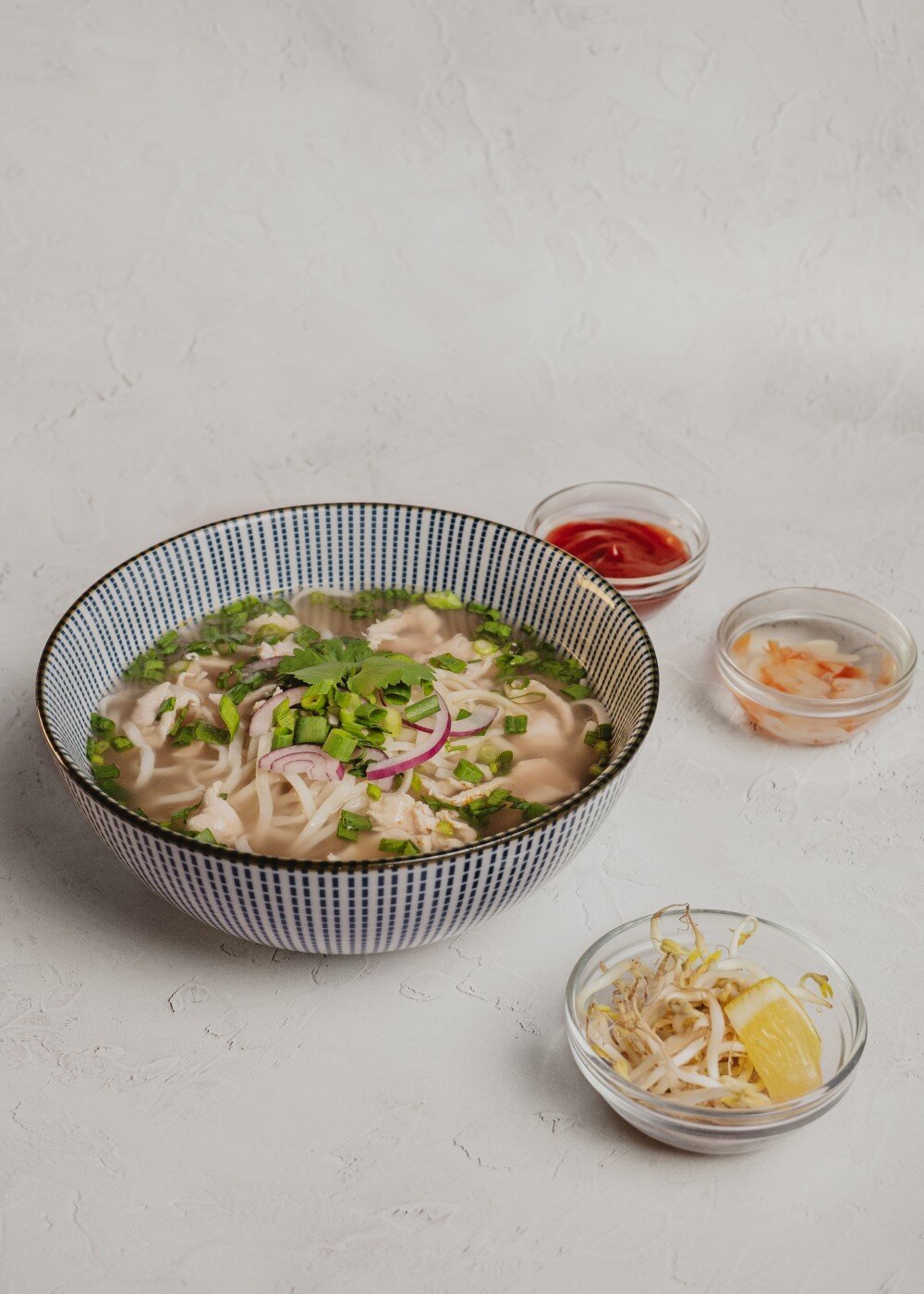 В основу супа входят насыщенный мясной бульон, лапша удон, тонко нарезанная говядина/курица, зеленый и красный лук.