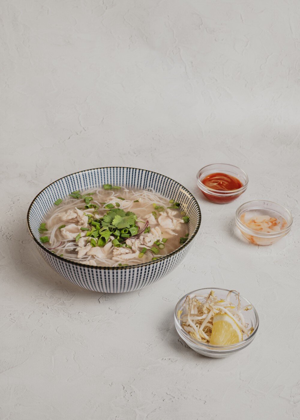 Разновидность супа с лапшой. В основу супа входят насыщенный мясной бульон, рисовая лапша, варенная курица, кинза, зеленый и красный лук. Подается с соусом ширача и уксусным, ростками сои и лимона.