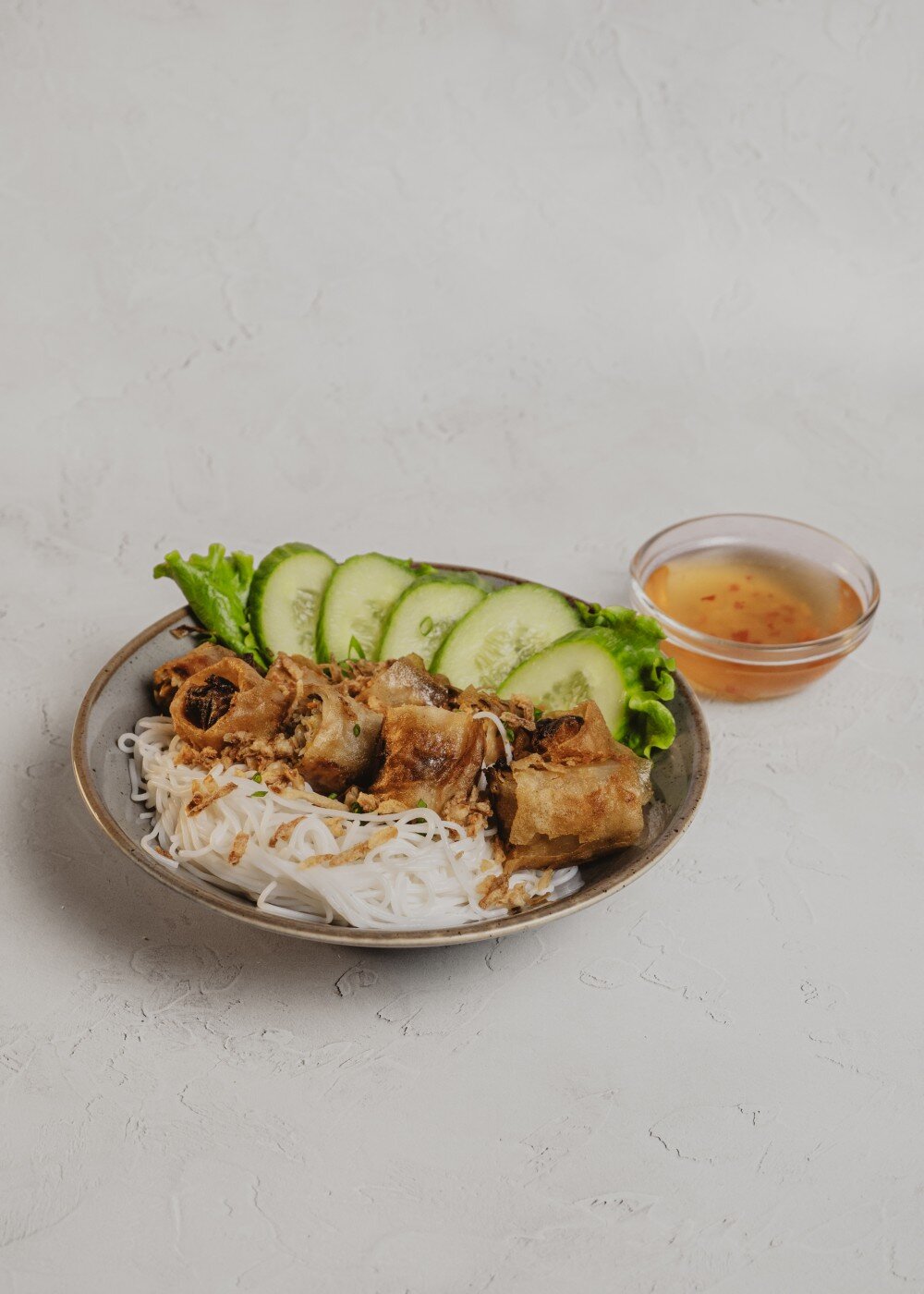 Традиционное вьетнамское блюдо на основе рисовой лапши. Обычно подаётся с ароматным фирменным соусов, жаренными нэм со свининой, свежими овощами и травами.