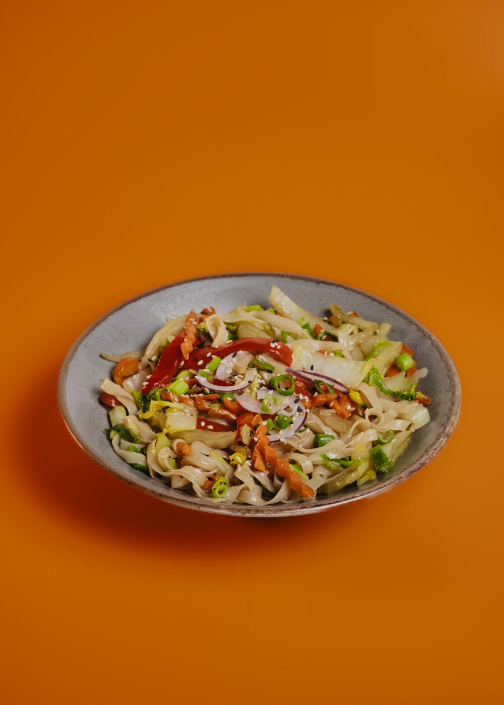 Тушеные овощи с лапшой на выбор, фирменный соус, пекинская капуста, морковь, сладкий перец, ростки сои, кунжут и зелень. На выбор: лапша удон, фунчоза и фо (рисовая лапша).