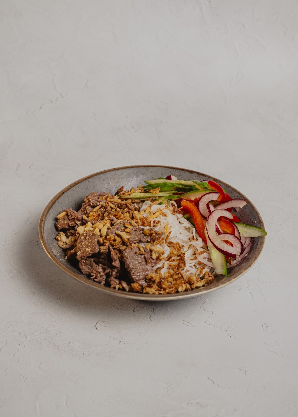 Салат из огурца, моркови, сладкого перца, красного лука, ростков сои, кинзы. В основе идет рисовая лапша. Салат посыпан арахисом и заправлен фирменным соусом. На выбор: креветка, говядина или курица.