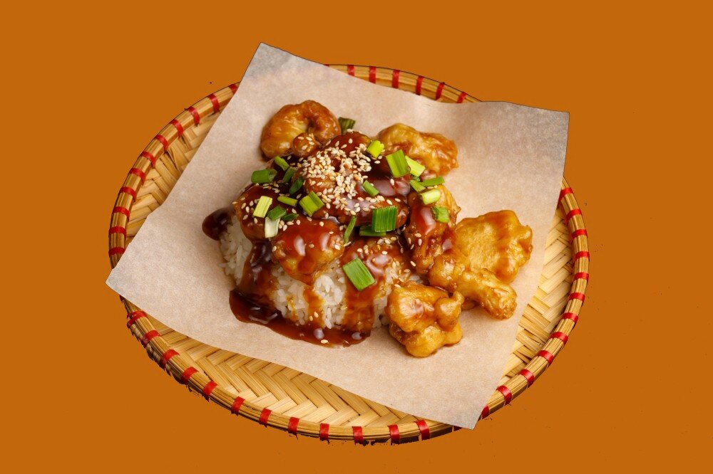 Золотистые кусочки курицы в кисло-сладком соусе, всё это на подушке пушистого риса и посыпанное зеленью.